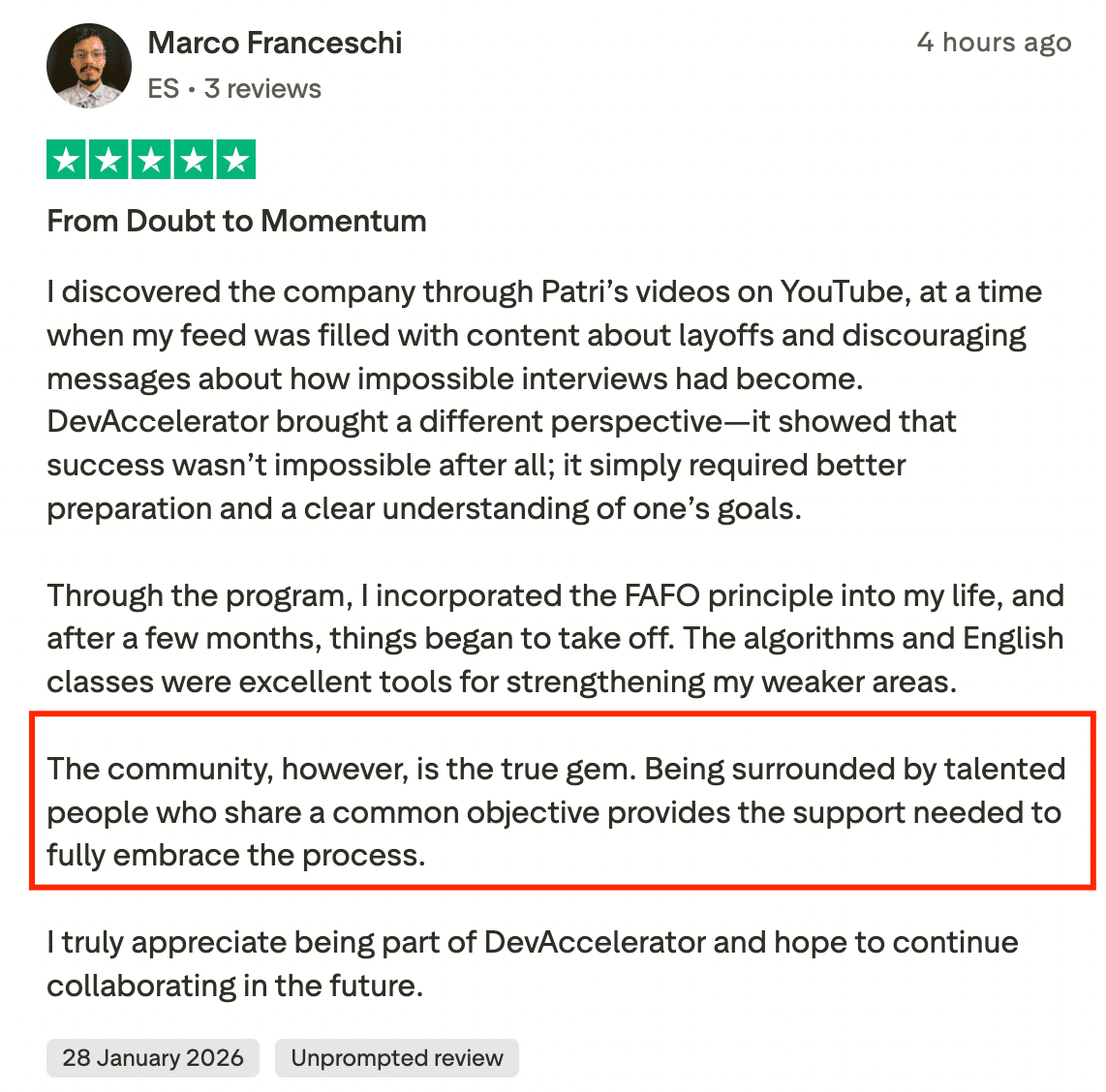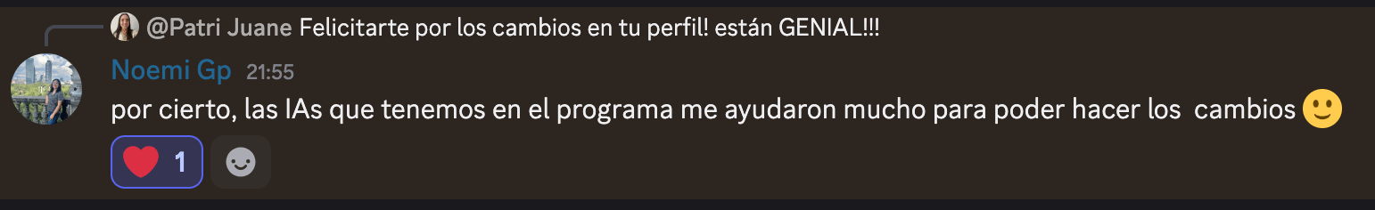 Y un largo etcétera... Una Masterclass con muchos consejos interesantes, y mucha participación. En cuanto a otras novedades DevAccelerator™...Estos días están siendo muy intensos. En resumidas cuentas, están siendo una mezcla de llamadas, mensajes, y muchos proyectos en marcha. Esta misma semana compartí el caso de Marco, y su reciente oferta FinTech... Y este fue el testimonio que nos ha dejado, destacando lo mucho que valoraba nuestra comunidad: He tenido además conversaciones muy interesantes con otros de nuestros Members... ✅ Carolina me está ayudando a desarrollar un Roadmap para Software Developers in Test (SDET) y QA Engineers ✅ Los proyectos de #TheStartupExperience™ ya están en desarrollo: ✅ Muchos members están sacando proyectos personales adelante: ✅ Otros están reforzando su perfil y CV, tal como ha hecho Noemí... Por otro lado... ...uno de mis objetivos de 2026 es quitarme el síndrome del impostor y empezar a identificarme como creadora de contenido (al fin y al cabo, también es mi profesión). De hecho, ayer mismo estrené mi nueva cámara para YouTube. La calidad es palpable: Mi próximo objetivo será mejorar el audio del canal. 🎙️ Y por último y no menos importante, te dejo un adelanto del que será mi gran foco a lo largo este 2026.... Más info los próximos meses. 🤫 Y si todo esto es de tu interés... En Offer Sprint™ by DevAccelerator™ ayudamos a Profesionales del Software y Data a trabajar en entornos internacionales y acelerar su carrera profesional. Escríbeme el código 66 en Instagram, y te paso los detalles 🚀 -Patri |