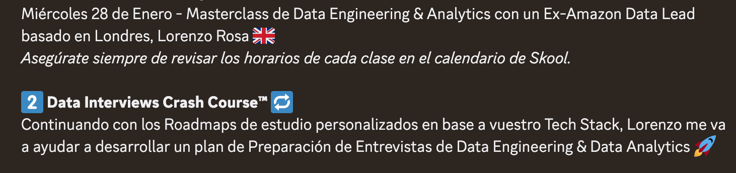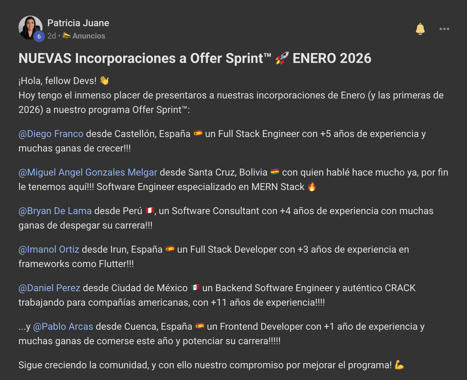 Hola, fellow dev 👋 Espero que hayas tenido un comienzo de año INCREÍBLE. El nuestro ha sido, para sorpresa de nadie, muy intenso. Mi objetivo hoy es compartir contigo los puntos destacados de los últimos días, para que veas qué está sucediendo en el programa detrás de las cámaras. Lo primero y más importante... Hemos dado la bienvenida a nuestros nuevos Members en la comunidad:Perfiles con diferentes tech stacks y años de experiencia, que sin duda aumentan nuestra diversidad de backgrounds. Hay algo que todos tienen en común: SU HAMBRE POR DESPEGAR SU CARRERA PROFESIONAL 🔥 Además de ello... Esta semana hemos arrancado el año con una sesión de Game Plan para comernos este 2026:Ha sido una sesión centrada en Mentalidad, Construcción de Hábitos + Plan de Acción para arrancar con fuerza el año. Y a lo que buenas noticias se refiere... Tenemos a un nuevo miembro en el equipo DevAccelerator™, Enrique 🚀Enrique y yo llevamos trabajando juntos desde hace años, por lo que por fin puedo decir con la máxima alegría que es un gustazo trabajar con él y contar con él como parte del equipo DevAccelerator™. Es nuestro nuevo responsable de Admisiones y me ayudará a mejorar también nuestro soporte al cliente, algo que desde el principio ha sido nuestra máxima prioridad. Si alguien me hubiese dicho que trabajar con gente así es posible hace años... ¡no les habría creído! Lo cierto es que en DevAccelerator™ tenemos un equipo increíble que continúa creciendo 🤩 De hecho... nuestros colaboradores en el plan formativo continúan aumentando.En apenas 2 semanas... Un Data Tech Lead con experiencia en Amazon, Lorenzo Rosa, vendrá al programa a ayudarme a desarrollar un Roadmap de Estudio para Profesionales Data 💪Y para seguir la ronda de buenas noticias, por último Y NO MENOS IMPORTANTE... Quiero FELICITAR PÚBLICAMENTE a mi alumno Julián, por su OFERTÓN como SENIOR DATA ANALYST!Algo que se merece enormemente por su brillante actitud, esfuerzo y motivación - tras apenas DOS MESES en el programa 🤯🤯🤯🤯🤯¡ABSOLUTAMENTE INCREÍBLE! Y en cuanto a ti... Si quieres aprender cómo otros profesionales de Software & Data están impulsando su carrera profesional y conectando entre sí, no dudes en unirte a nuestra comunidad en Skool. Si lo haces, podrás recibir mis cursos gratuitos "Modelo Lean Engineers™" & "Developer Playbook". Y si tu también quieres que te ayudemos a impulsar tu carrera... Decirte que ya tenemos a varias personas apuntadas para comenzar con nosotros en Febrero. Si quieres que una de nuestras 7 plazas mensuales sea tuya en Febrero, respóndeme "66" y te paso los detalles 🚀 ¡FE RADICAL ESTE 2026, CRACK! Te mando un abrazo gigante, -Patri |