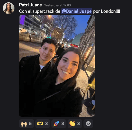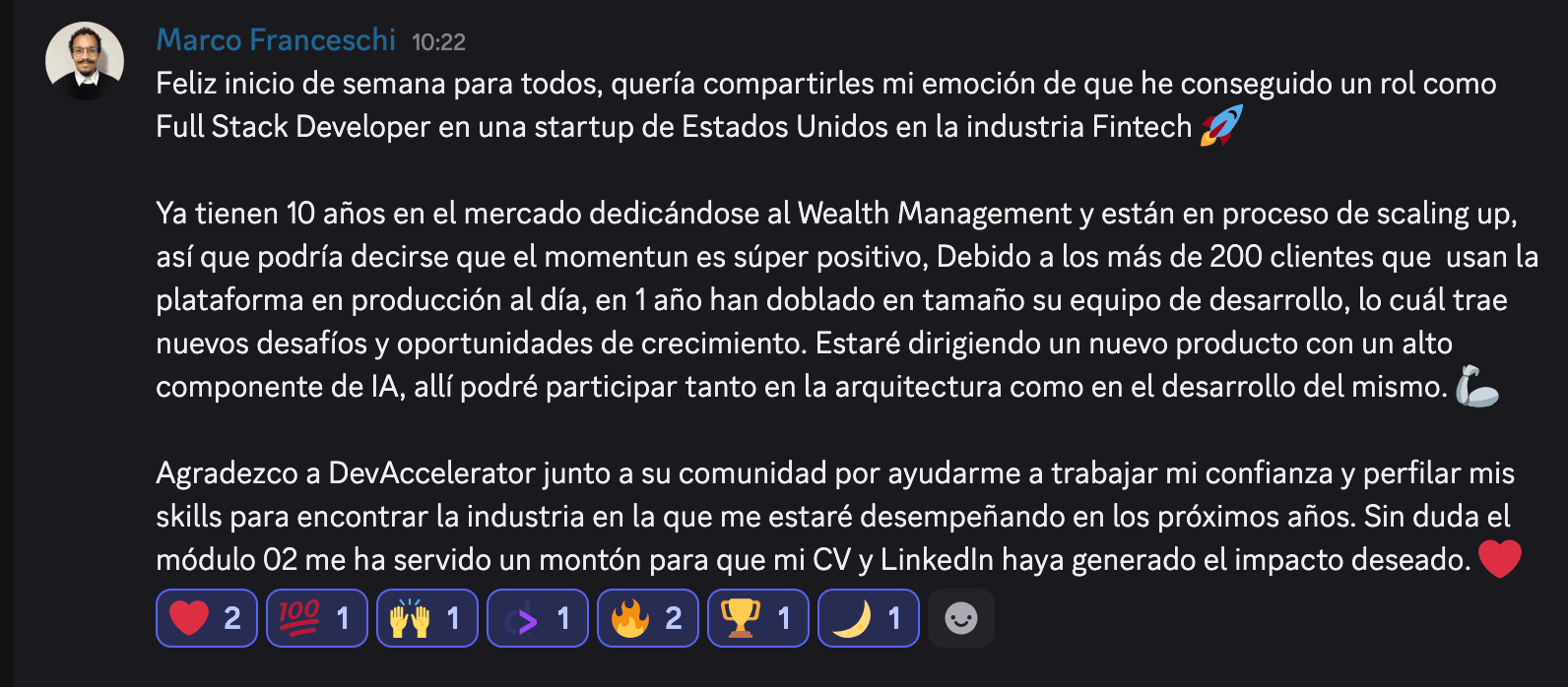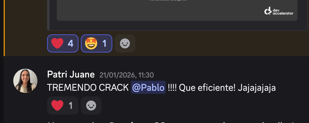 Feliz Viernes, fellow dev 👋 Últimamente hemos estado teniendo muy buenas noticias dentro de la comunidad. Hemos cogido momentum, y Enero ha empezado con energías renovadas. Permíteme resumirte cómo ha sido nuestra semana: Hemos celebrado la oferta de JuliánComo parte de esta buena energía, Julián compartió conmigo cómo fue su proceso de selección, y cómo le aportó nuestro programa y comunidad. Si no lo has hecho todavía, puedes ver nuestra charla aquí. He conocido a Dani en persona en LondresOtro de los grandes acontecimientos para mi esta última semana ha sido poder conocer al crack de Dani aquí en London. Dani se encontraba de viaje exprés por Reino Unido, y pasamos un rato increíble. ¡Da gusto poder conversar con personas tan inteligentes como él! Nuestro alumno Pablo ha creado una plantilla con recursos del programa¡Como lo oyes! Pablo ha dedicado su tiempo y esfuerzo a preparar una plantilla increíble, similar a nuestro DeveloperOS™, con recursos del programa + otros enlaces de utilidad. ¡MUY TOP! De hecho, esta fue la opinión de Bryan acerca de nuestra Wiki, DeveloperOS™: Nueva persona en el equipo DevAccelerator™Desde aquí quiero dar la bienvenida a Ana, nuestra nueva Content Manager, que me ayudará a preparar la estrategia de contenidos en redes mes a mes de mi marca personal y de DevAccelerator™ 🚀 Mirad un ejemplo de pieza de contenido que ha preparado... simplemente INCREÍBLE: ¡Bienvenida, Ana! Mi charla con Oscar, ex-Amazon EngineerHe podido tener una conversación de nivel 11 sobre 10 con Oscar, uno de nuestros Members. He extraído una barbaridad de aprendizajes sobre su experiencia y carrera... Que podrás escuchar pronto también. 😉 Y por último y no menos importante...¡EL OFERTÓN 100% REMOTO DE MARCO COMO FULL STACK ENGINEER PARA UNA FINTECH AMERICANA!Marco compartió este mensaje con nosotros los últimos días. IMPRESIONANTE!!!!!!! La semana que viene podrás conocer su caso más en detalle 💪🚀 Y en cuanto a ti... Desearte un fin de semana increíble, champ. 💪 Y si tu también quieres Acelerar tu Carrera como Developer en Empresas Internacionales... Nos queda una plaza para que puedas acceder a Offer Sprint™ en Febrero. Escríbeme el código 66 en Instagram, y te paso los detalles 🚀 -Patri |