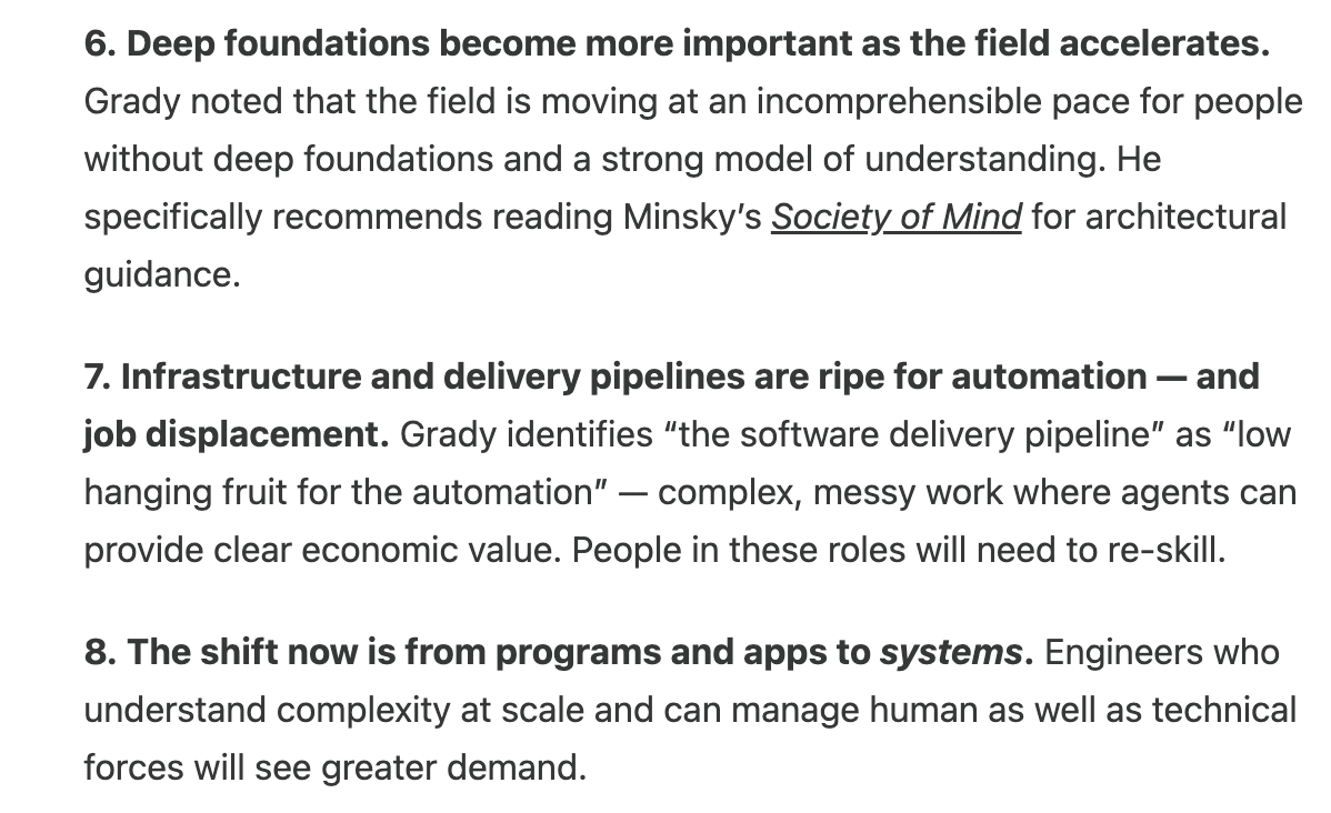 Feliz Viernes, fellow dev 👋 Como cada semana... Quiero terminar haciendo una recapitulación de lo que hemos hecho en la comunidad estos días, además de compartir updates Tech relevantes contigo. 1️⃣ Nuevos members en Offer Sprint™...Esta semana han entrado muchas caras nuevas a la comunidad: Profesionales con muchísima motivación y ganas, y que además tendrán su Workshop de Onboarding el próximo Martes. Estoy deseando que comiencen su paso por aquí... ¡Y que 2026 sea el año que marque un antes y un después en su futuro profesional! 2️⃣ Así estamos usando la IA en DevAccelerator™...Otra de las noticias que compartí con ellos es que... Tal y como defiende Dan Martel, autor del conocido libro "Buy back your time" - la IA es una amplificadora de tus acciones, y jamás una sustituta de las mismas. Es por eso que mi equipo y yo estamos construyendo sistemas que nos van a permitir ayudar a nuestros Members de una forma más personalizada... ...almacenando toda su información y KPIs... ...y provocando que su éxito sea MEDIBLE, y en consecuencia, INEVITABLE. 3️⃣ Mi Entrevista con uno de nuestros Big Tech Engineers, Oscar, ya está DISPONIBLE!Mi charla con Oscar ya se ha publicado en YouTube. Fue una conversación llena de aprendizajes y consejos interesantes, que no tengo duda te podrán ayudar. 📺 Puedes escucharla aquí.Una de las cosas que más me gustan de tener una comunidad en constante desarrollo es... Que estoy en contacto con nuestros Members cada día. 4️⃣ De hecho, la última semana tuve una conversación increíble con Carolina, una de nuestras SDET con más experiencia internacional, que pronto podrás ver en detalle...Además de estar pendiente de múltiples procesos de selección que están realizando nuestros Members de forma activa este mes. De hecho, otro se ha transformado en oferta... 5️⃣ ...ya que Berenice, una de nuestras Software Engineers, ha recibido una oferta EdTech en España!!!!En fin... Paro ya por hoy, pero podría seguir hablando de avances en la formación, o de las clases de inglés + algoritmia que los alumnos han tenido esta semana. 💡 Te dejo una última reflexión:Y es que justo hoy se ha publicado la entrevista que The Pragmatic Engineer ha realizado a Grady Booch, el padre de UML y una de las figuras más importantes de la historia de la Ingeniería del Software. ¿Sabes qué mencionó acerca de los avances de la IA? ✅ La CRECIENTE importancia de tener conocimiento fundacional ✅ Cómo la demanda de saber construir Sistemas marca la diferencia para los Software Engineers cada vez más!!! ...algo en lo que justo nos vamos a enfocar en Offer Sprint™ los próximos meses 😉 Pronto te comparto noticias 🚀 Así que este fin de semana, sólo recuerda: ¡Busca la excelencia en todo lo que hagas! La vida es demasiado corta como para no conocer la mejor versión que podrías alcanzar. - Patri P.D.: y si todo esto es de tu interés... en Offer Sprint™ by DevAccelerator™ ayudamos a Software, Data y QA Engineers a trabajar en entornos internacionales y acelerar su carrera profesional. Actualmente, nuestras plazas están cerradas, pero no dudes en unirte a nuestra lista de espera. |
