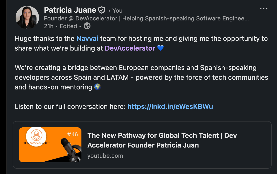 y sobre todo... De qué tenemos más ganas de cara al año que viene 🚀¿Sabes cuál fue una de mis reflexiones? Que no puedo tener más ganas de que llegue el 2026. En 2025, hemos asentado los pilares de algo mucho más grande, y que nuestros alumnos ya saben. Algo que compartí en la entrevista que me hicieron en un Podcast Fintech de Reino Unido, The Navvai Shift: 👉 Puedes ver dicha Entrevista completa aquíY algo que hace apenas dos meses yo planteaba en nuestro Roadmap como algo que quería conseguir de cara a los próximos 3 a 5 años... y que en apenas 2 meses, ya está a punto de hacerse realidad 🤯 En fin... Me callo ya por hoy, pero sólo quiero desearte un fin de semana excepcional. Descansa y desconecta, que las fiestas de Navidad están a la vuelta de la esquina. ☺️ Y por último recuerda siempre, ¡busca la excelencia en todo lo que hagas! La vida es demasiado corta como para no conocer la mejor versión que podrías alcanzar. - Patri P.D.: recordarte que estoy haciendo un sorteo de una beca de $1,000 para que puedas formarte con nosotros en DevAccelerator™ por mis +20.000 seguidores en Instagram. Aquí tienes los detalles. |