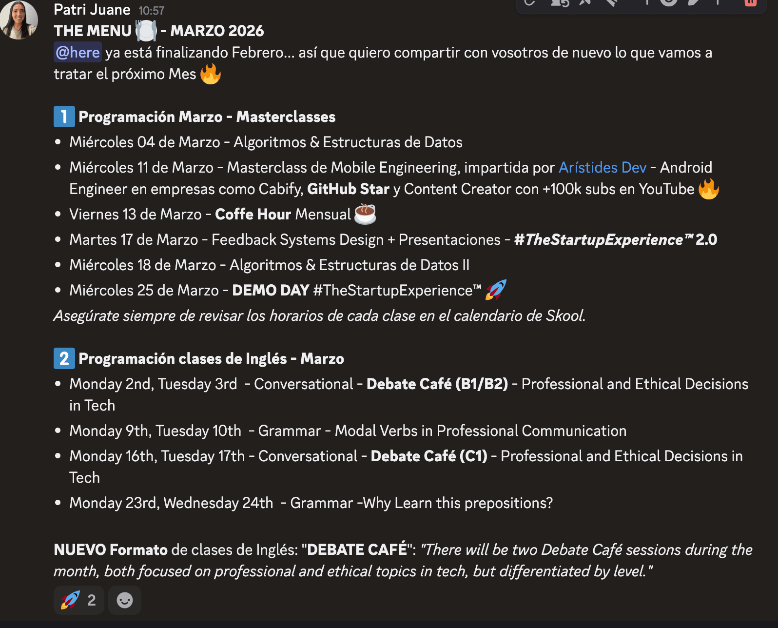 ...y un largo etcétera! Fue un Taller muy divertido y con mucha participación, y yo lo disfruté mucho 💪 Además... Ya he compartido con nuestros alumnos lo que vamos a ver en Offer Sprint™ el mes de Marzo 🚀Como ves, será un mes intenso lleno de sesiones en directo... Y de participaciones de profesionales INCREÍBLES, de la talla de... AristiDevs: Android Engineer (ex-Cabify), GitHub Star y Creador de Contenido 🚀Quien vendrá a la comunidad a ayudarme... ✅ A impartir una Masterclass de Entrevistas Técnicas para perfiles Mobile ✅ A preparar un Roadmap de Estudio para Mobile Devs + Mobile Engineers!! Simplemente increíble... En cuanto a nuestros alumnos, tengo muchísimas updates que compartir contigo (este Domingo descubrirás una tremendamente importante!). Comencemos... 1️⃣ Mi Charla con Carolina, nuestra SDET más experimentada en la comunidad, ya está disponible en YouTube - puedes verla aquíTratamos temas tan relevantes como tendencias de contratación en el ecosistema Tech de LATAM... O nuestro punto de vista como Mujeres en la industria Tech. 2️⃣ Así están avanzando los proyectos de #TheStartupExperience™ 2.0...La iniciativa favorita de nuestros Members… Donde construyen Productos Software (MVPs) en equipo: