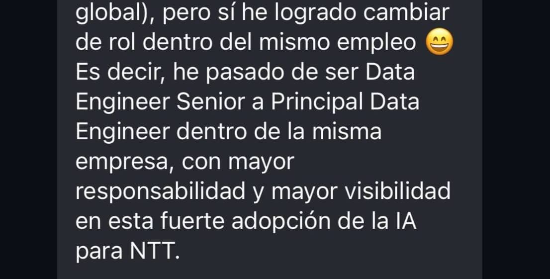 Pronto conocerás cuáles son 😉💰 Por no mencionar el caso de personas como Karen, quien acaba de ser PROMOCIONADA a Principal Data Engineer dentro de NTT Data... MENUDA MÁQUINA 🔥🤯 Continuemos... 5️⃣ La Segunda Fase de Nuestro Roadmap... (de convertirnos en un B2B Talent Partner) … ya está en MARCHA...Muy atento a mis redes el segundo trimestre de este año... Comienza una nueva etapa en la compañía 🌍 🔀 🌎 Y es que en cuanto a construir... Estamos armando distintos sistemas. 6️⃣ Escalar una Formación PERSONALIZADA YA es posible... y aquí lo estamos haciendo gracias a la IA 🤖Mi equipo y yo estamos construyendo flujos de trabajo para poder enviar Feedback PERSONALIZADO cada mes a nuestros members. He realizado muchísimos programas de formación, y te puedo asegurar... Que NADIE guarda información de sus clientes... Y por ello NO obtienen los resultados que esperaban. 🆕 Y por último y no menos importante... nuestro PRIMER evento Presencial en España llegará dentro de poco más de 2 MESES...Más info al respecto MUY pronto. Sólo digo que...