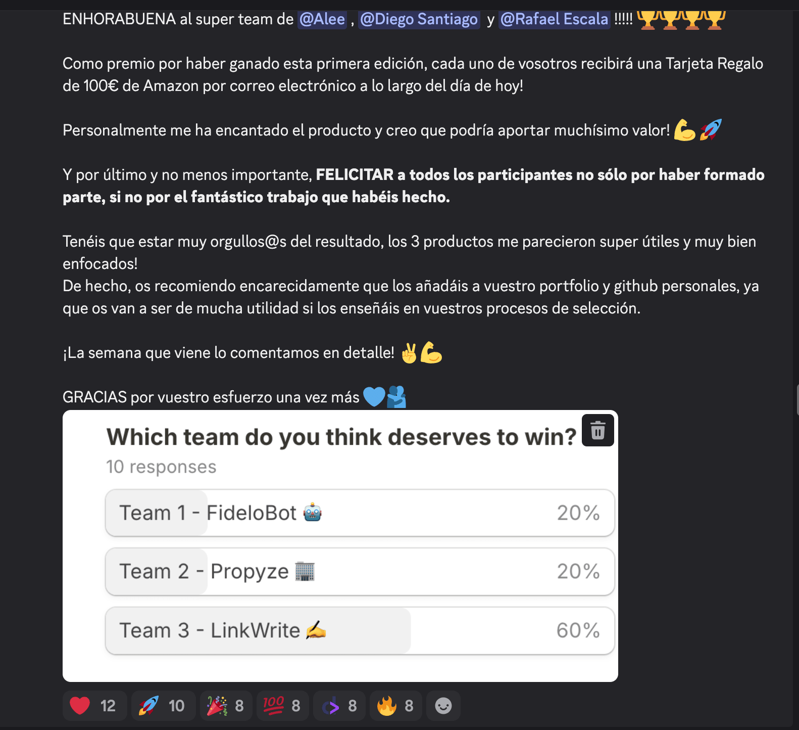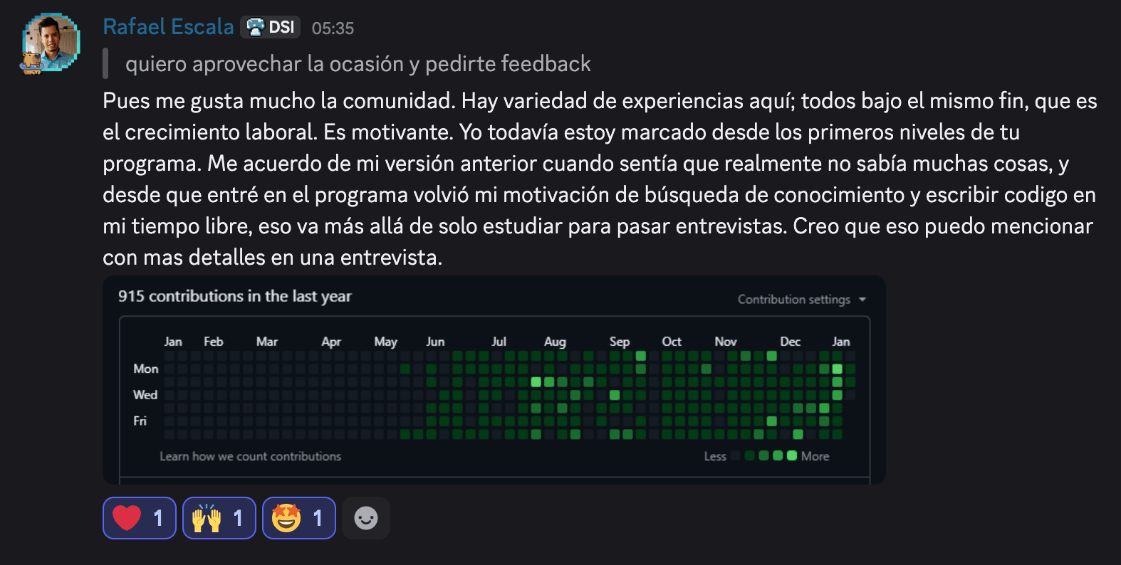 Ser Senior Engineer & Architect en una compañía de San Francisco 🇺🇸Y nuestro NUEVO Profesor de A.I. + SYSTEMS en DevAccelerator™ 👨🏫Hola, fellow dev 👋 Uno de los puntos fuertes de nuestra comunidad es... La enorme cantidad de profesionales con experiencia Internacional con la que contamos aquí. Tanto es así, que algunos de ellos no sólo cuentan con la misma... Si no que llevan más de una década trabajando para compañías extranjeras. Pues bien... Ese es el caso de Rafa.Un caso que te va a interesar muchísimo, y que hoy quiero exponer contigo. 💪 Rafa es una persona con una trayectoria profesional excepcional... ✅ NO realizó estudios de Informática en la Universidad (su formación universitaria fue en negocios y Marketing) ✅ Original de Perú, comenzó a trabajar como Frontend Developer de forma autodidacta, haciendo webs con HTML y Javascript ✅ Consiguió acceder al Sector Tech a través de una Software Factory... para terminar formando parte de una Compañía de San Francisco, EEUU 🇺🇸, donde lleva trabajando más de 7 años. Un ejemplo CLARO de consistencia, trabajo duro... y mentalidad a largo plazo.Pero es que además... Dentro de nuestra comunidad en DevAccelerator™, Rafa ha sido una persona tremendamente participativa y comprometida. Desde que se unió a nosotros, Rafa ha participado en múltiples iniciativas: Su Victoria en #TheStartupExperience™Formando un equipazo junto a Alejandro (nuestro MVP en el último trimestre del 2025) y Diego Santiago (Lead Engineer con amplia experiencia con base en Chile)... Rafa ganó la primera edición de nuestra iniciativa de construcción de proyectos en equipo con IA. Juntos desarrollaron un plugin de LinkedIn con Inteligencia Artificial integrada, LinkWrite. Dicha aplicación contaba además con una extensión de Google Chrome, lo que facilitaba su utilización enormemente... Sin duda, un PRODUCTAZO con poca fricción y facilidad de uso, reflejando a la perfección la atención al detalle y la atención al User Experience que los 3 Ingenieros mostraron. Construyeron dicha aplicación utilizando Express, Node.js + una integración con GroqAI. Esta fue la arquitectura final (orientada a escalabilidad futura): Todo ello les permitió ganar la iniciativa por Mayoría, y llevarse el trofeo 🏆 de equipo ganador: Se les recompensó con una tarjeta regalo de Amazon, así como un pequeño detalle personal que les envié por correo postal ☺️ Ademas de dicha iniciativa, recientemente Rafa me destacó... El Poder de la ComunidadEn una conversación reciente, compartió conmigo la enorme motivación que ha obtenido desde que forma parte de DevAccelerator™... El cambio de actividad en Github... refleja a la perfección ese boost de motivación, algo que me hace tremendamente feliz observar 🤩 (Fíjate que Rafa se incorporó a nuestra comunidad el pasado mes de Junio). Empezar en YouTubeDe hecho, uno de los proyectos que está llevando a cabo este año es hacer crecer su Canal de YouTube sobre Systems Design (canal al que te recomiendo ENCARECIDAMENTE que te suscribas!): Su proactividad, capacidad técnica y conocimientos me han demostrado lo siguiente... Quiero a personas como él en mi equipo. Y es que algo que defiendo una y otra vez es que en DevAccelerator™, GANAMOS JUNTOS... Así que a partir de ahora... Él será nuestro NUEVO profesor de AI + SYSTEMS DESIGN:Desde aquí quiero dar públicamente las GRACIAS a Rafa por su buena disposición y colaboración, y felicitarle por incorporarse a nuestro equipo. Así que si quieres conocer su trayectoria completa... Y sobre todo, cómo ha sido su paso completo por el programa hasta ahora... Puedes ver nuestra charla completa aquíP.D.: y si tu también quieres aumentar tu valor como Developer en entornos internacionales... Escríbeme el código "66" por Instagram, y te paso los detalles 🚀 -Patri |