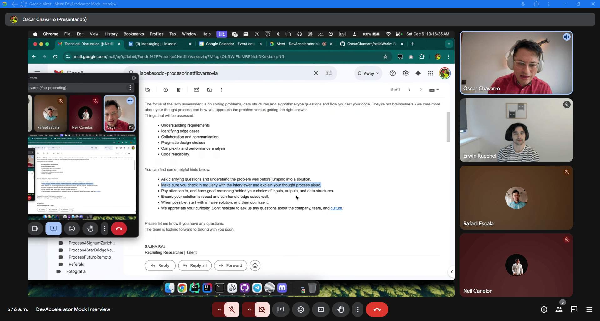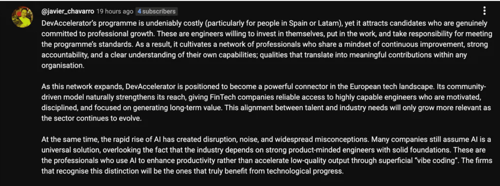 Hola, fellow dev 👋 Una de las cosas que más me alegran de tener una comunidad fuerte es... El efecto imán que se produce 🧲 Mediante el cual... El talento atrae a más talento.Pues bien... Hoy quiero presentarte a Oscar, uno de nuestros perfiles más destacados en la comunidad, y uno de nuestros miembros más activos. Te explico por qué: ✅ Óscar es un Software Engineer con más de una década de experiencia en compañías Big Tech + Scale Ups Internacionales. ✅ Original de Colombia, consiguió reubicarse a Madrid, España, gracias a una oferta de empleo en Amazon como Software Engineer. Además de trabajar durante años en Amazon, con todos los aprendizajes que eso conlleva... ✅ Posteriormente ha trabajado para Scale Ups españolas líderes en su sector e increíblemente difíciles de acceder, tales como Glovo o The Workshop. Como puedes observar... Su trayectoria profesional es excepcional.De hecho, Óscar comenzó sus estudios universitarios siendo MUY joven. Su esfuerzo y alta capacidad le permitieron trabajar desde muy pronto en grandes compañías desde Colombia, tales como Scotiabank o Royal Caribbean. En cuanto a su paso por DevAccelerator™...Desde el principio, Oscar ha sido un miembro tremendamente activo, motivo por el cual estoy muy agradecida con él. Ha ayudado a otros Members de forma desinteresada, practicando Mock Interviews de empresas Big Tech: Como parte de nuestra iniciativa de construcción de proyectos con IA, #TheStartupExperience™, va a construir un producto de mucha utilidad para búsqueda de empleo en Tech... ... y hace unas semanas, esta fue su opinión pública sobre nuestra comunidad: Así que quiero aprovechar esta oportunidad... Para agradecer a Óscar su enorme compromiso y dedicación con la comunidad.¡Es un lujo contar con él! Y en cuanto a ti... Si quieres aprender consejos IMPRESCINDIBLES de Oscar, una persona con experiencia en Big Tech + Scale Ups Internacionales...Ya puedes ver nuestra charla aquí.-Patri |